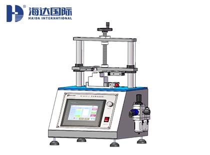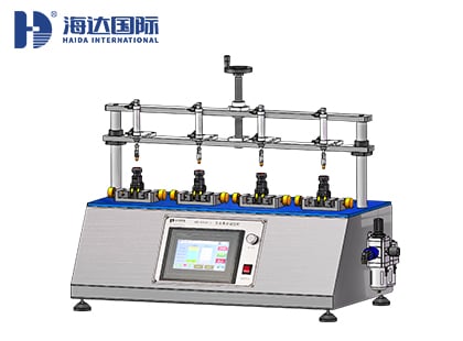 將樣品固定于本機(jī)夾具上(帶電測試樣品需要鎖緊快速插頭),扭緊螺桿把手使樣品固定。旋轉(zhuǎn)氣缸則在調(diào)好適當(dāng)高度情況下,往復(fù)旋轉(zhuǎn)按鈕,直到樣品損壞,記錄點(diǎn)動(dòng)次數(shù)。
