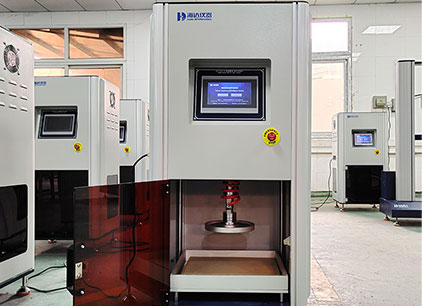 海綿壓陷試驗(yàn):當(dāng)試樣進(jìn)行壓陷試驗(yàn)時(shí),取下頂梁中間位置的S型傳感器。將試樣置于上、下壓盤間,上壓盤以規(guī)定速度向下壓縮一定尺寸的試樣至國(guó)家標(biāo)準(zhǔn)要求的A法(B法、C法)所規(guī)定的凹度時(shí),其上的荷重元將感應(yīng)到的壓力反饋給電腦處理并顯示,從而測(cè)得海綿、泡沫等試樣材料的壓陷硬度。